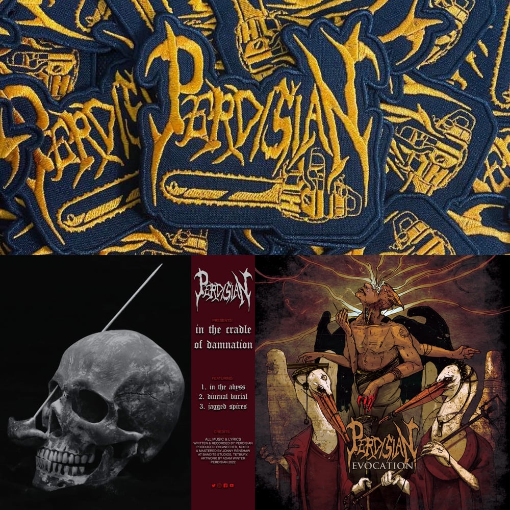 Patch with orange embroidered chainsaw logo. (artwork by Adam Winter)